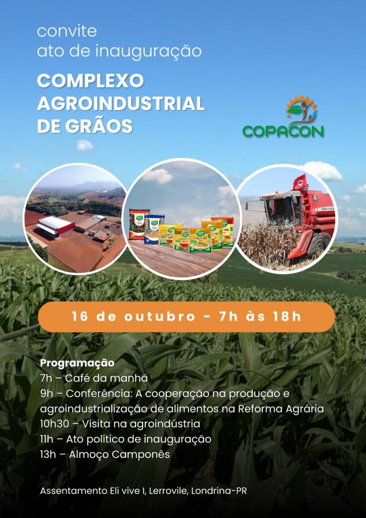 No dia 16 de outubro, Dia Mundial da Alimentação e da Soberania Alimentar, a Cooperativa Agroindustrial de Produção e Comercialização Conquista (Copacon), localizada no assentamento Eli Vive, em Londrina, vai inaugurar o Complexo Agroindustrial de Grãos Agroecológico, com capacidade de beneficiar até 40 toneladas de feijão em apenas 8 horas de trabalho. O ato de inauguração contará com a presença de ministros, autoridades políticas e do economista João Pedro Stédile, integrante da coordenação nacional do Movimento dos Trabalhadores Rurais Sem Terra (MST).