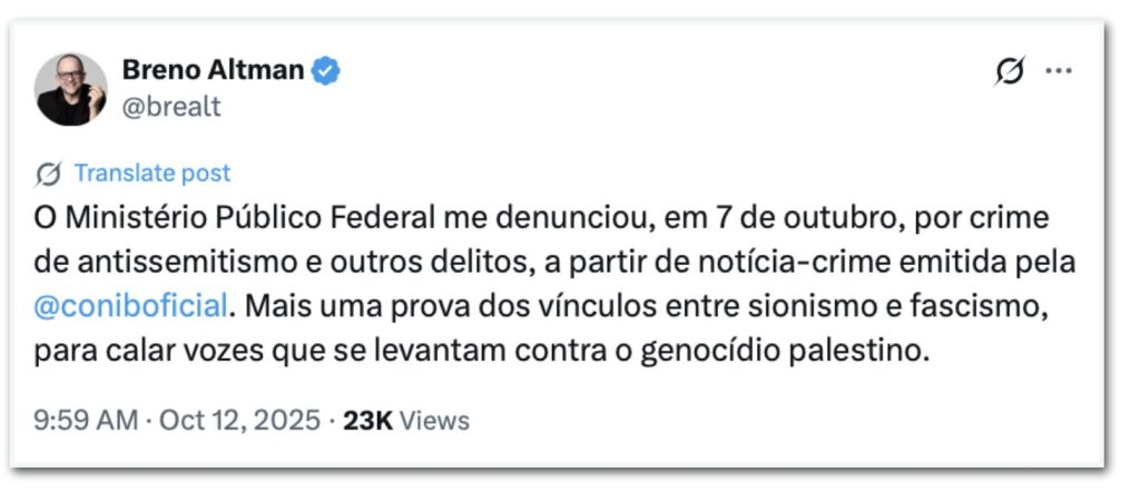 Não é a primeira vez que a entidade tenta calar Breno. Em 2023, a Polícia Federal chegou a investigar os posicionamentos do jornalista, concluindo pela não existência de crime.