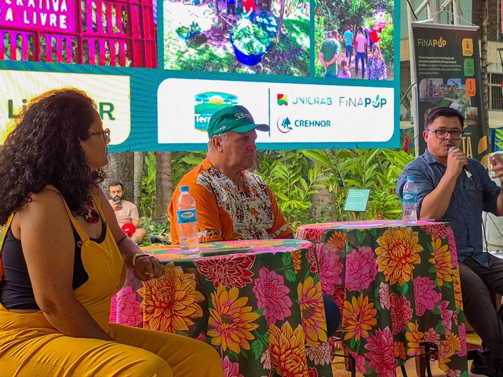 Durante a conversa sobre os investimentos sustentáveis para a produção saudável, a Crehnor (Cooperativa de Crédito Rural dos Pequenos Agricultores e da Reforma Agrária) e o Finapop (Financiamento Popular para Alimentos Saudáveis) dialogaram com camponeses e representantes da sociedade e de cooperativas sobre o fomento à produção agroecológica.