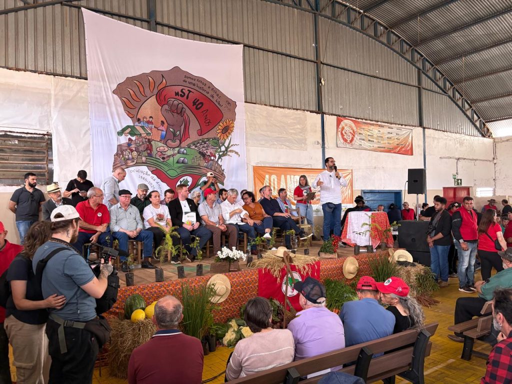 Após o almoço, o ministro Paulo Teixeira visitou a Feira Estadual da Reforma Agrária Popular – MST 40 anos. A atividade continuou durante a tarde com seminários simultâneos. O primeiro dia de celebração dos 40 anos da Annoni reforçou a trajetória de resistência do MST no Rio Grande do Sul, a importância histórica da ocupação para a reforma agrária no país e a retomada de políticas públicas voltadas para a produção de alimentos, cidadania e fortalecimento das comunidades rurais.