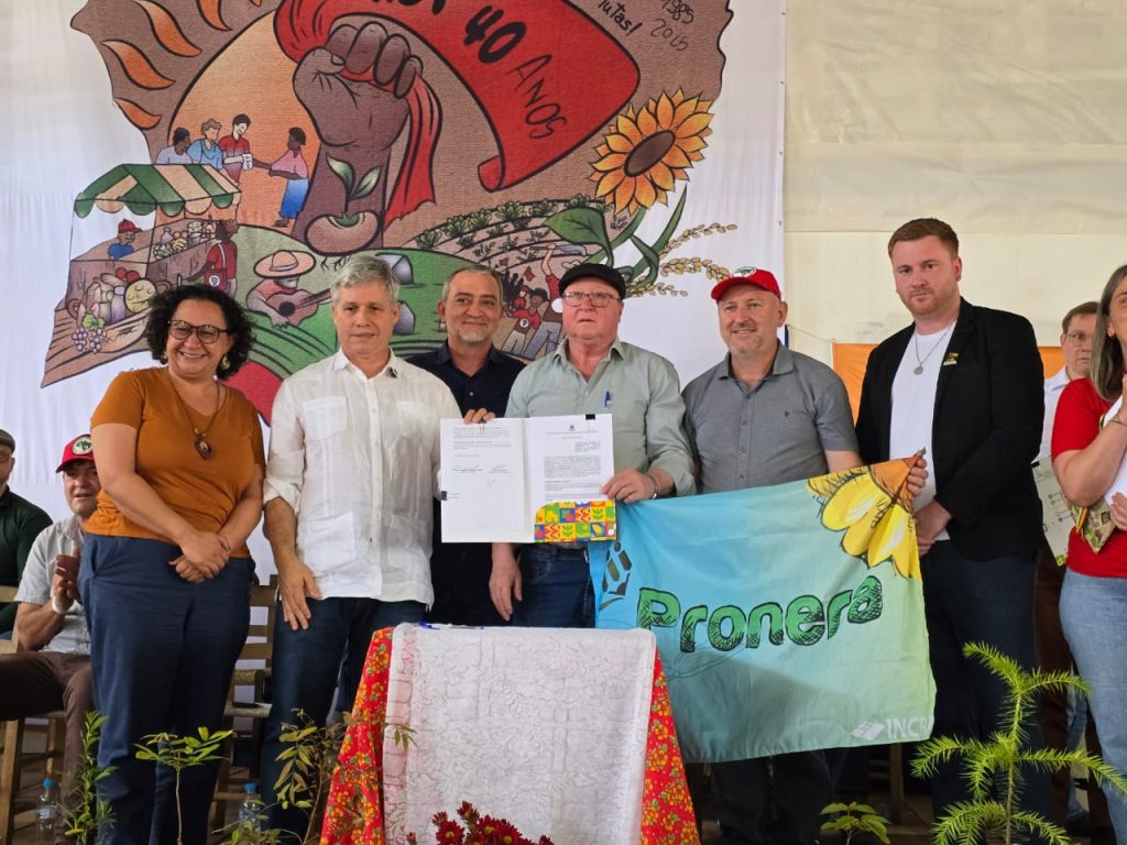 Durante a solenidade, o ministro Paulo Teixeira destacou que o governo federal resgatou os programas de reforma agrária que haviam sido paralisados nos últimos anos, retomando a desapropriação de terras e o apoio a assentamentos. Ele afirmou que, neste ano, o país atingirá um recorde de novas famílias assentadas e que estão sendo concedidos R$ 2,2 bilhões em crédito para a reforma agrária, beneficiando 100 mil famílias, sendo 11 mil no Rio Grande do Sul.