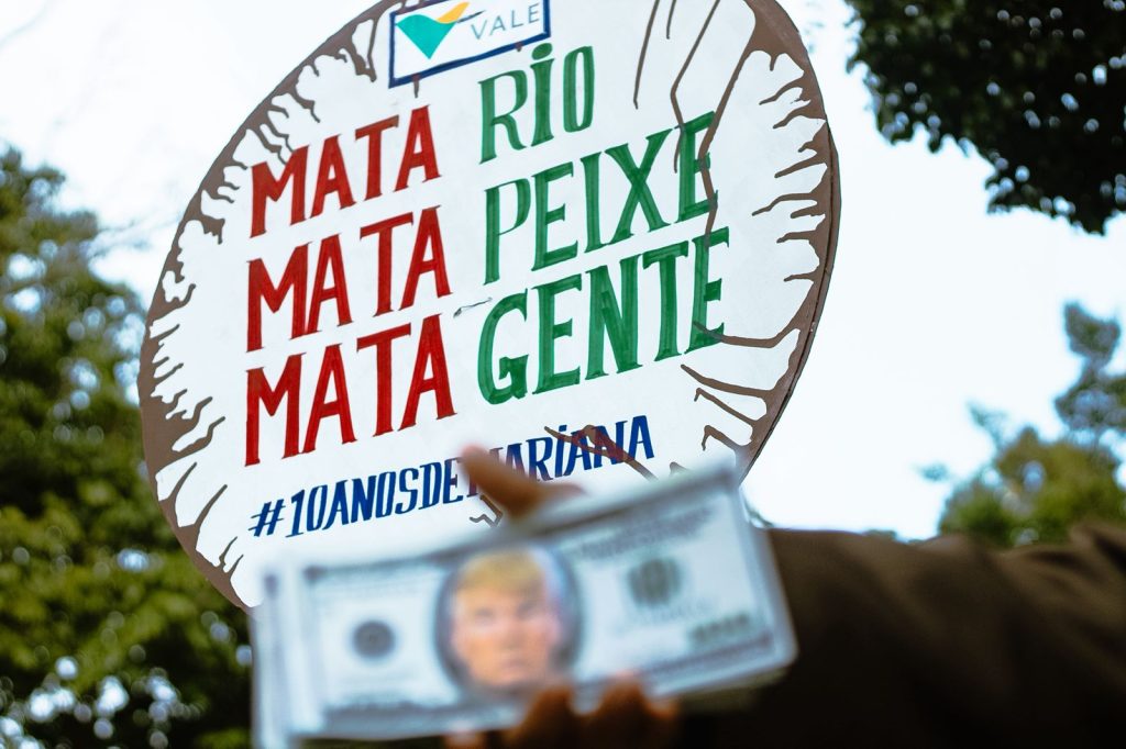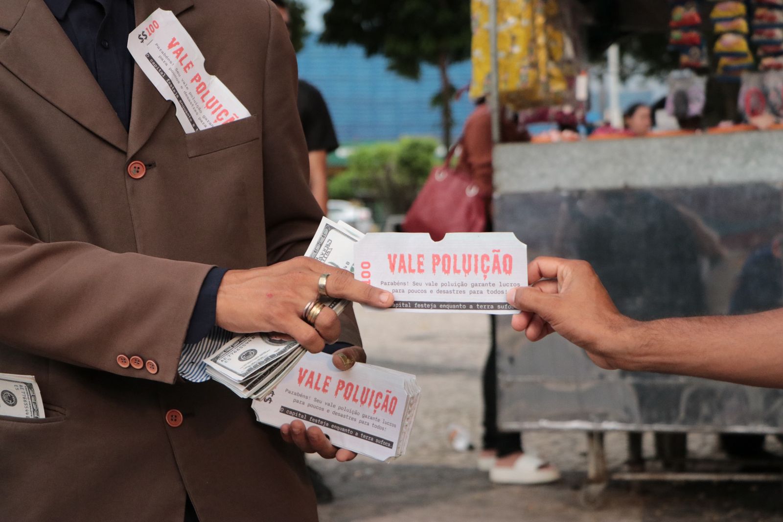 Na esteira das discussões sobre o clima, a ação simulou o leilão da vida de povos e comunidades tradicionais, das florestas e águas da Amazônia, com cartões de “Vale destruição” e cédulas de dinheiro estampadas com o rosto do presidente dos Estados Unidos, Donald Trump: “O único verde que importa é o verde do dinheiro!”.