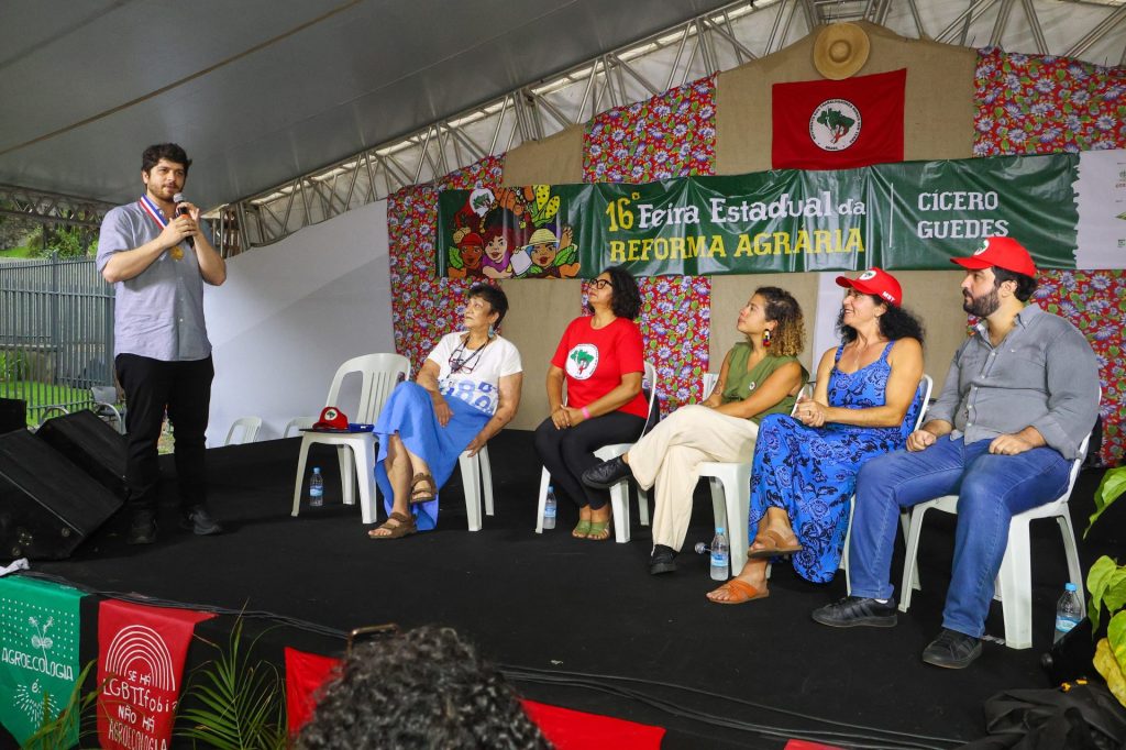 “Quero expressar a felicidade imensa do nosso mandato de fazer essa homenagem justamente durante a realização da 16ª Feira Estadual da Reforma Agrária Cícero Guedes porque isso significa conectar os fios que o capitalismo tenta desconectar, que é a luta pela terra e por memória, verdade e justiça. A luta por democracia não é algo do passado, é uma batalha que a gente trava no presente para honrar aqueles que tombaram e também criticar a manutenção da Polícia Militar, que continua torturando e matando as pessoas nas favelas e periferias”, afirmou Maíra.
