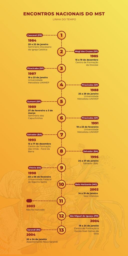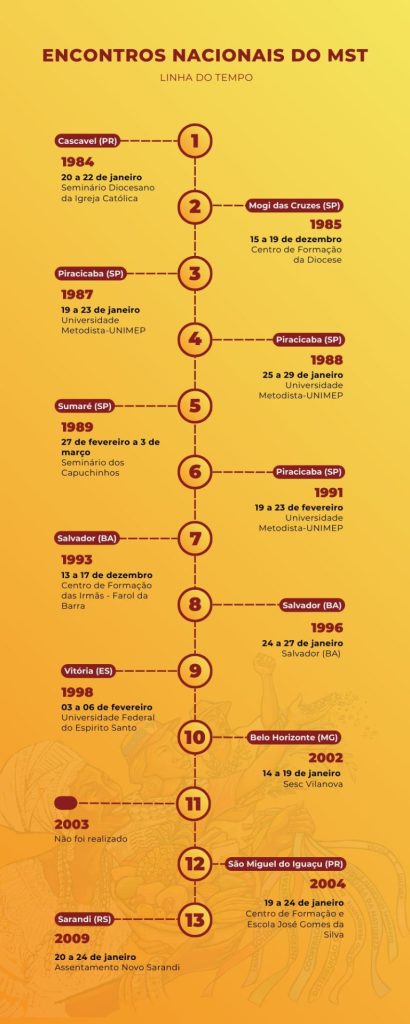 Ao longo do processo histórico de 42 anos de organização e luta pela terra e pela Reforma Agrária, tradicionalmente em alguns anos nos meses de janeiro, o Movimento dos Trabalhadores Rurais Sem Terra (MST), realiza seu Encontro Nacional, com a participação de delegados (famílias assentadas e acampadas, escolas, cooperativas e demais espaços do Movimento) de 23 estados, mais o Distrito Federal, onde o Movimento está organizado.
