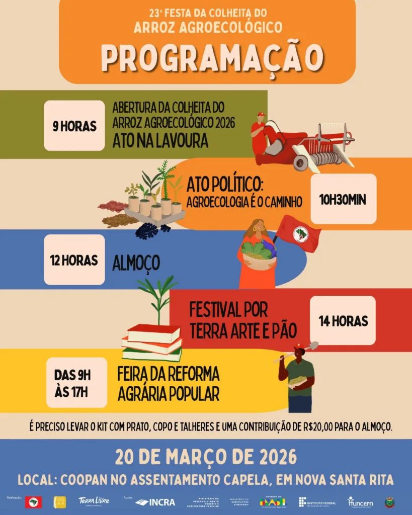 Com o tema “Agroecologia é o Caminho”, o Movimento dos Trabalhadores Rurais Sem Terra (MST) realiza nesta sexta-feira (20), a partir das 9h, a 23ª Festa da Colheita do Arroz Agroecológico. A expectativa é receber 2 mil pessoas. Segundo a organização, estão confirmados ônibus de todas as regiões do estado.