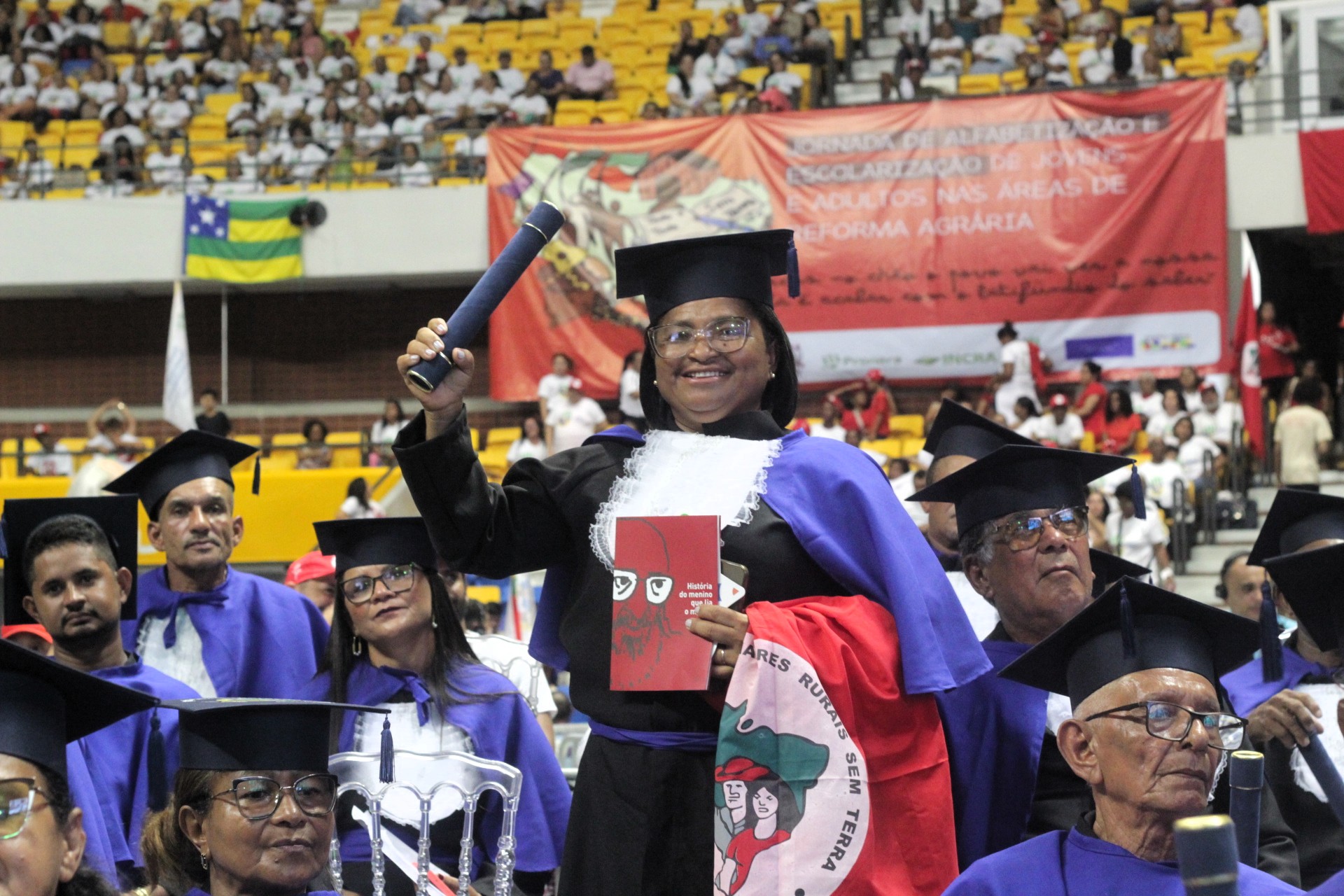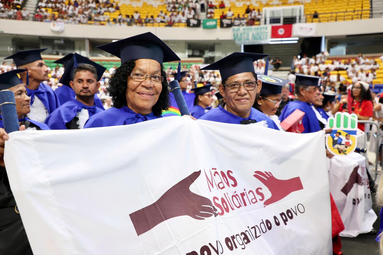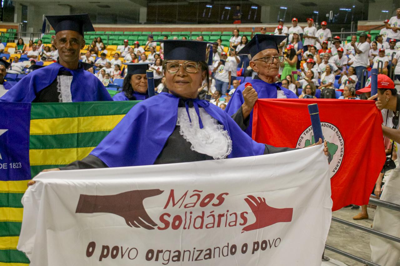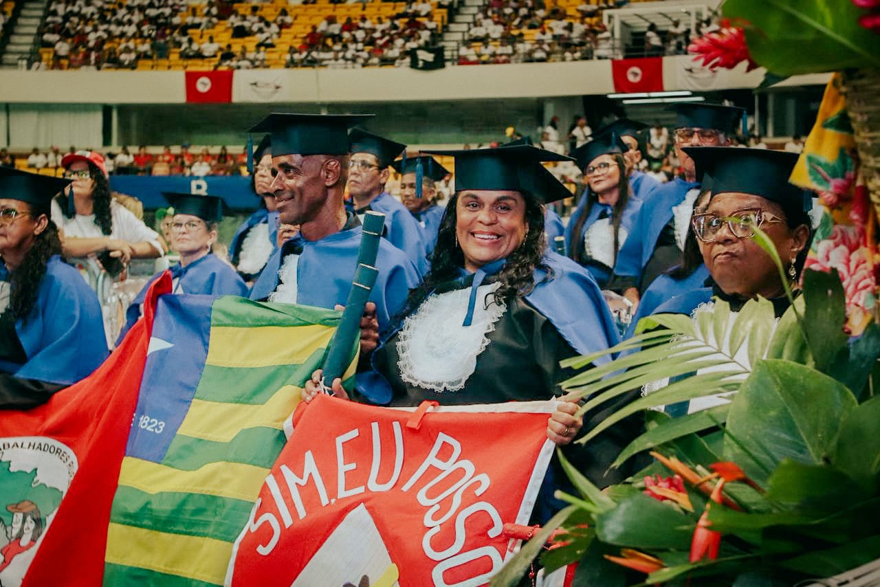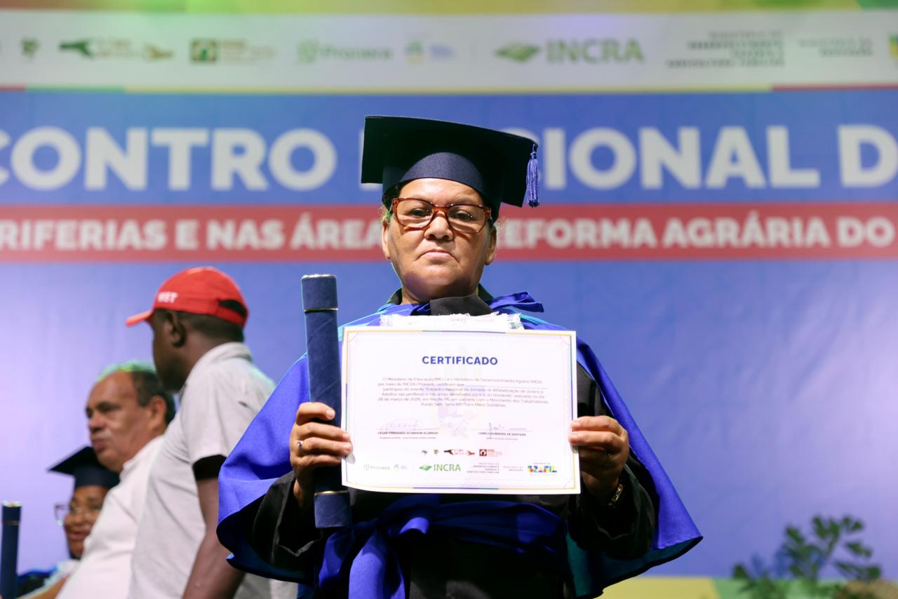 Para muitos participantes, a formatura representa uma mudança profunda na vida cotidiana. Geni Otaviano do Santos, acampada no Acampamento São José, em Paulo Afonso (BA), comemora a conclusão da jornada.