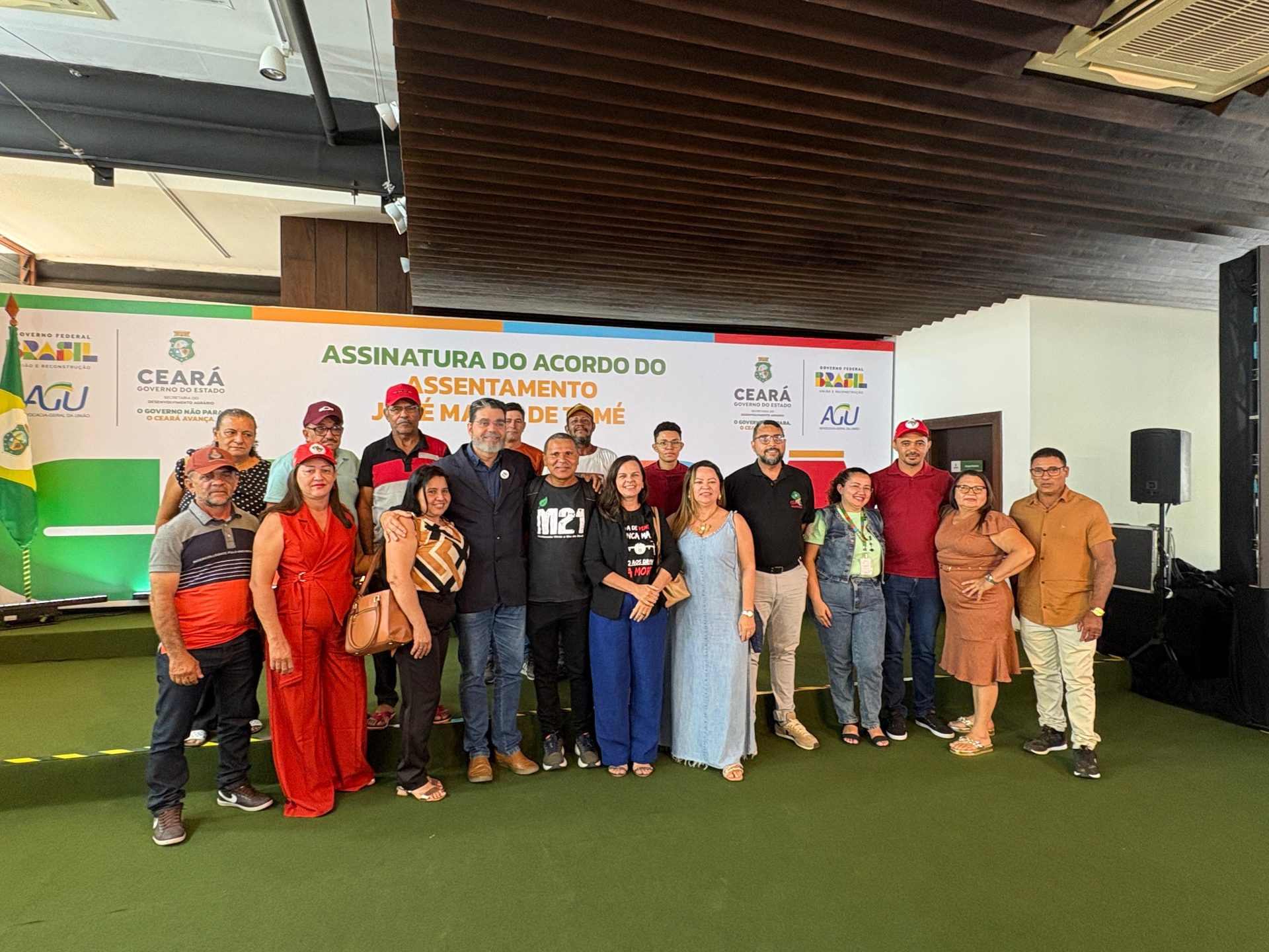 Acordo formaliza o assentamento Zé Maria do Tomé, destinado à Reforma Agrária Irrigada no Vale do Jaguaribe, com participação do governo do estado, Incra, IDACE, AGU, deputados estaduais e famílias assentadas